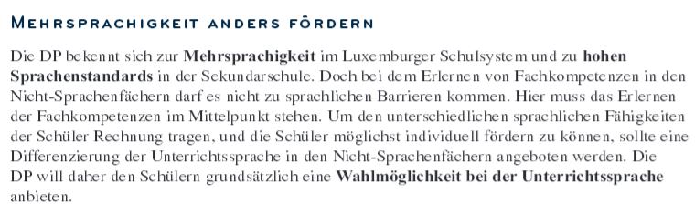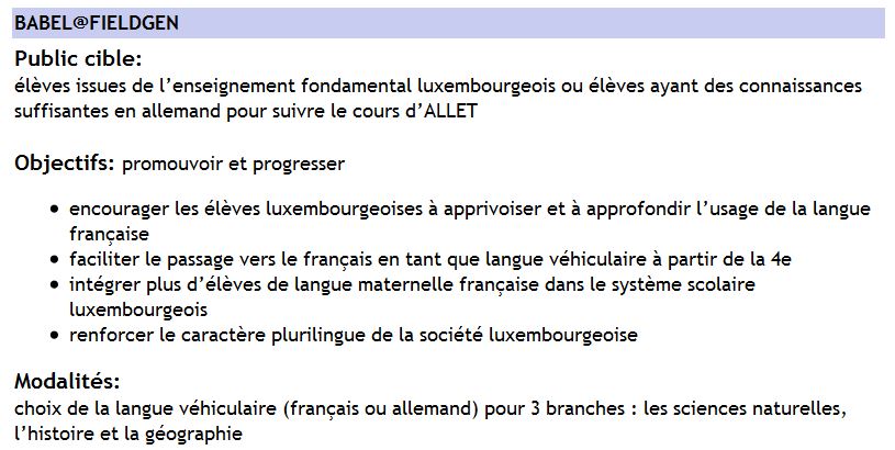 Ab dem nächsten Schuljahr bietet die École Privée Fieldgen in Luxemburg-Stadt auf der 7e des Enseignement classique die Fächer Geographie, Sciences naturelles und Geschichte in zwei Sprachen – Deutsch und Französisch – an (Bericht RTL Radio). Das Projekt “Babel” soll dann bis zur 5e weiter laufen. Schüler bekommen damit die freie Wahl in welcher Sprache sie das jeweilige Fach erlernen möchten: Ein erster Schritt in die richtige Richtung.